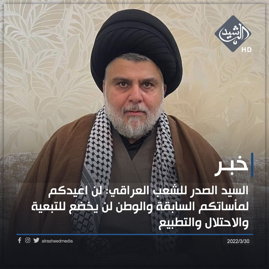 السيد الصدر للشعب العراقي: لن اعيدكم لمأساتكم السابقة والوطن لن يخضع للتبعية والاحتلال والتطبيع
