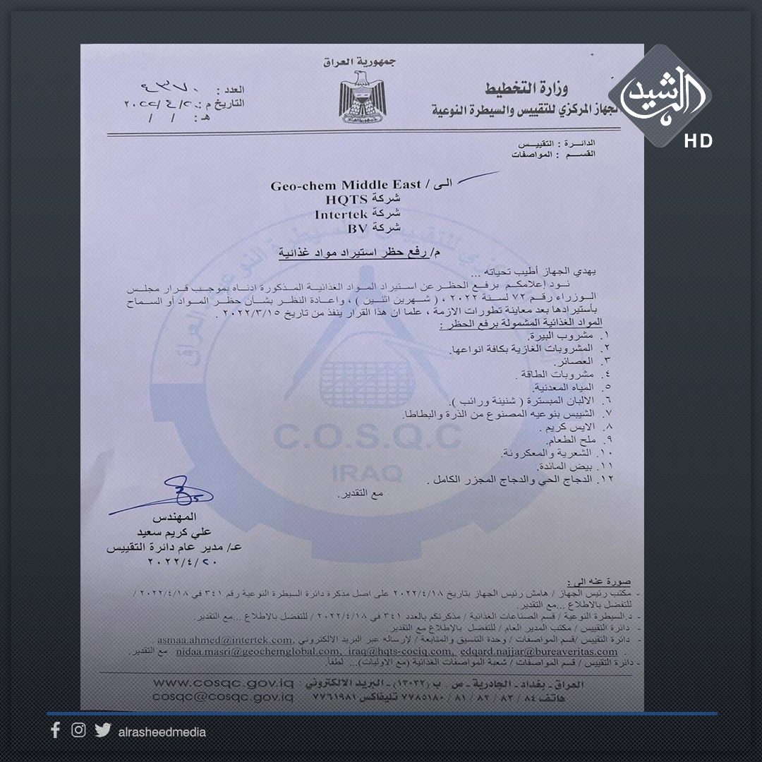 بالوثيقة .. العراق يرفع حظر الاستيراد عن 12 مادة غذائية