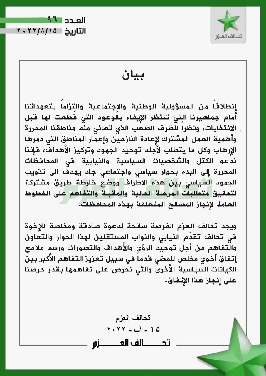 العزم يدعو حزب تقدم ونواب المحافظات المحررة للحوار لتحقيق متطلبات المرحلة الحالية