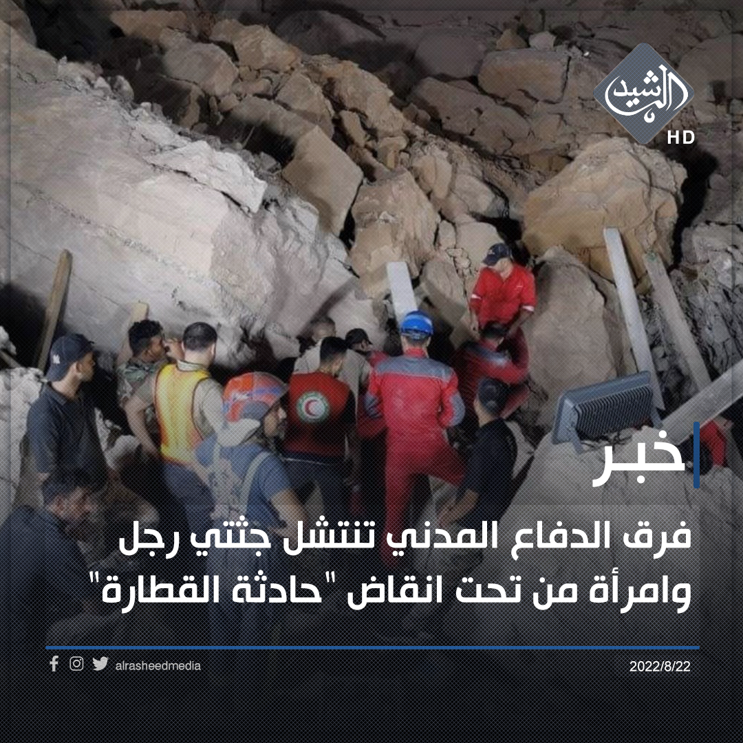 فرق الدفاع المدني تنتشل جثتي رجل وامرأة من تحت انقاض "حادثة القطارة"