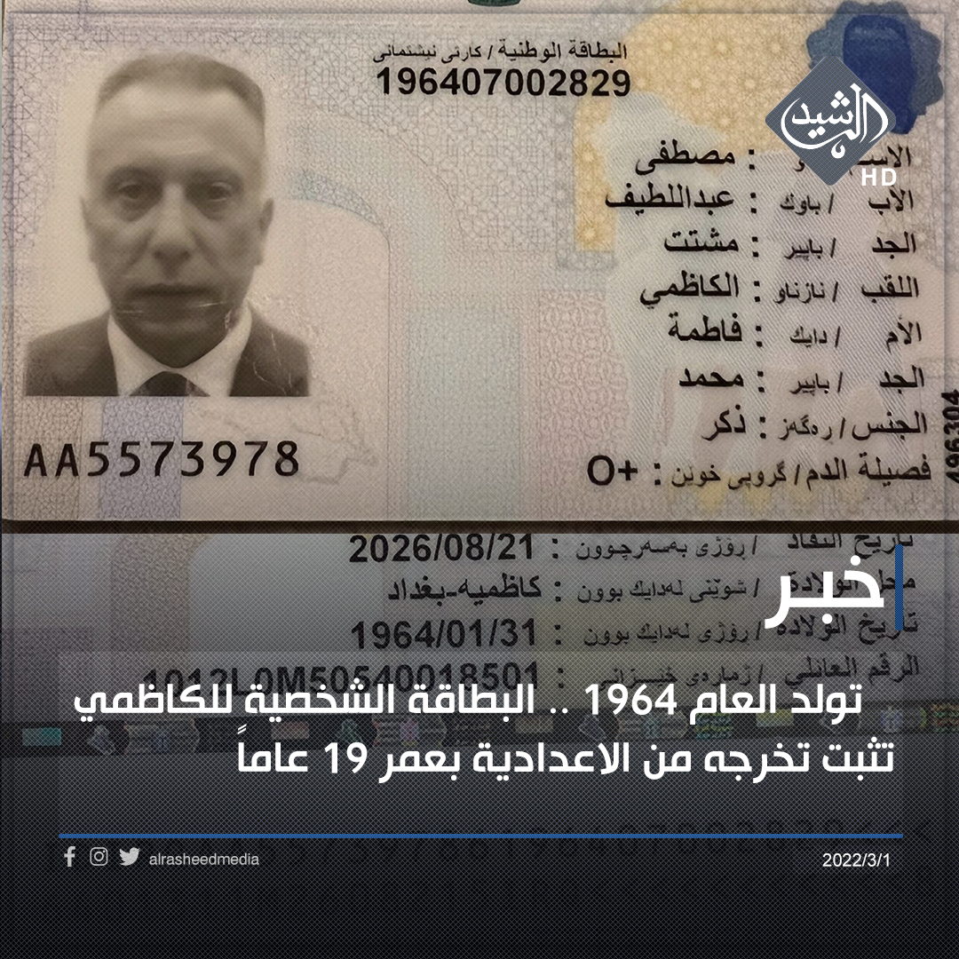 تولد العام 1964 .. البطاقة الشخصية للكاظمي تثبت تخرجه من الاعدادية بعمر 19 عاماً