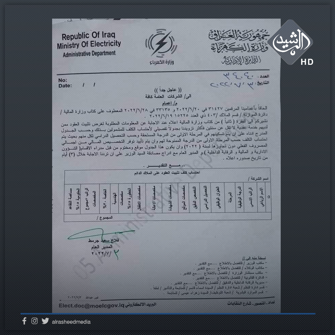بالوثيقة.. الكهرباء تصدر إعماماً باحتساب كلف تثبيت العقود على الملاك الدائم