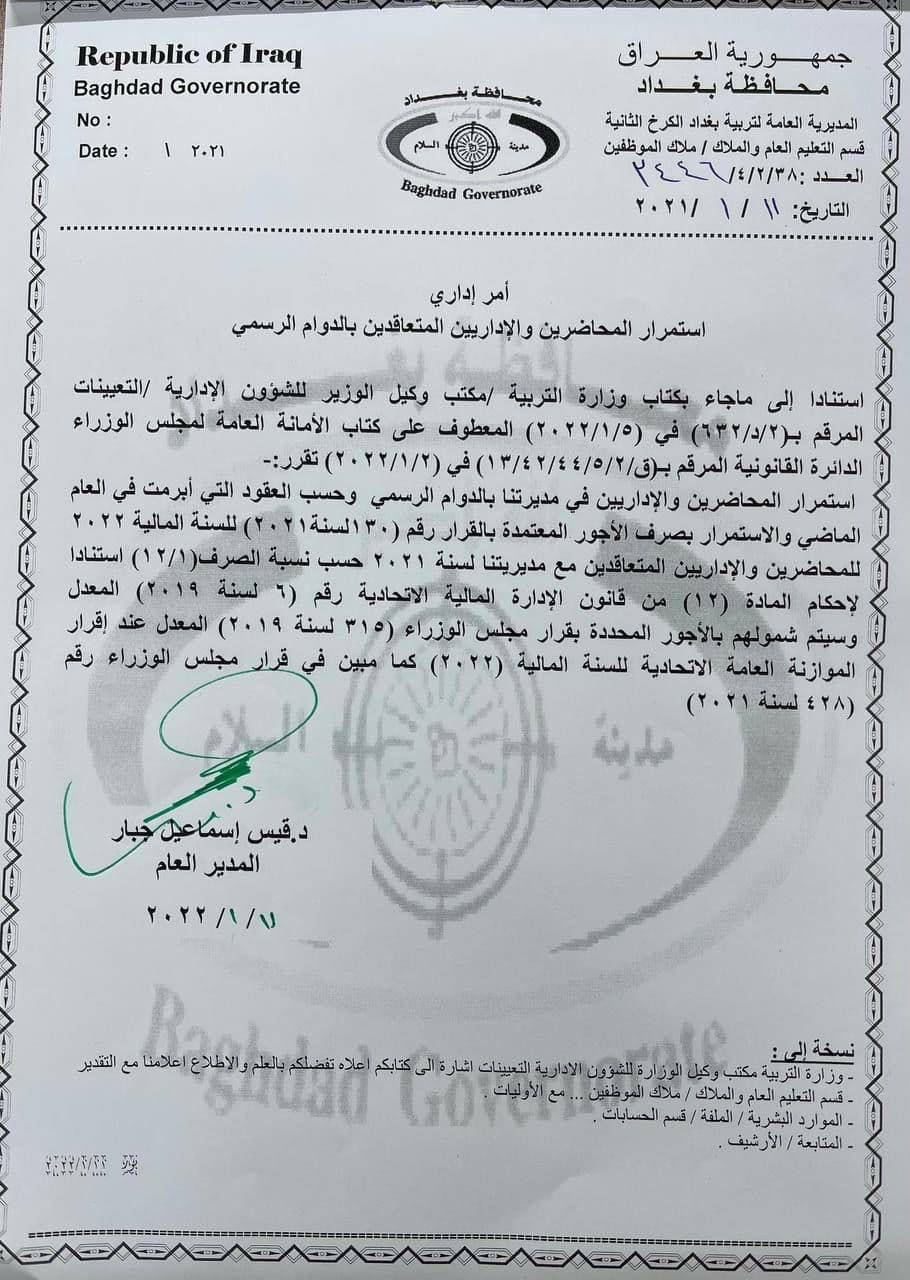بالوثيقة.. الكرخ الثانية تصدر الامر الخاص باستمرار التعاقد مع المحاضرين وصرف أجورهم