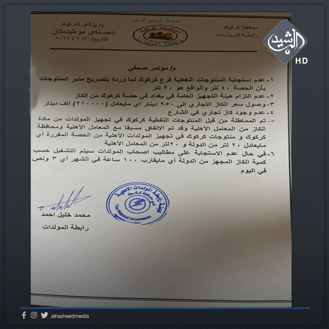 بالوثيقة.. اصحاب المولدات في كركوك يهددون بتقليل ساعات التشغيل الى ثلاث ونصف يوميا