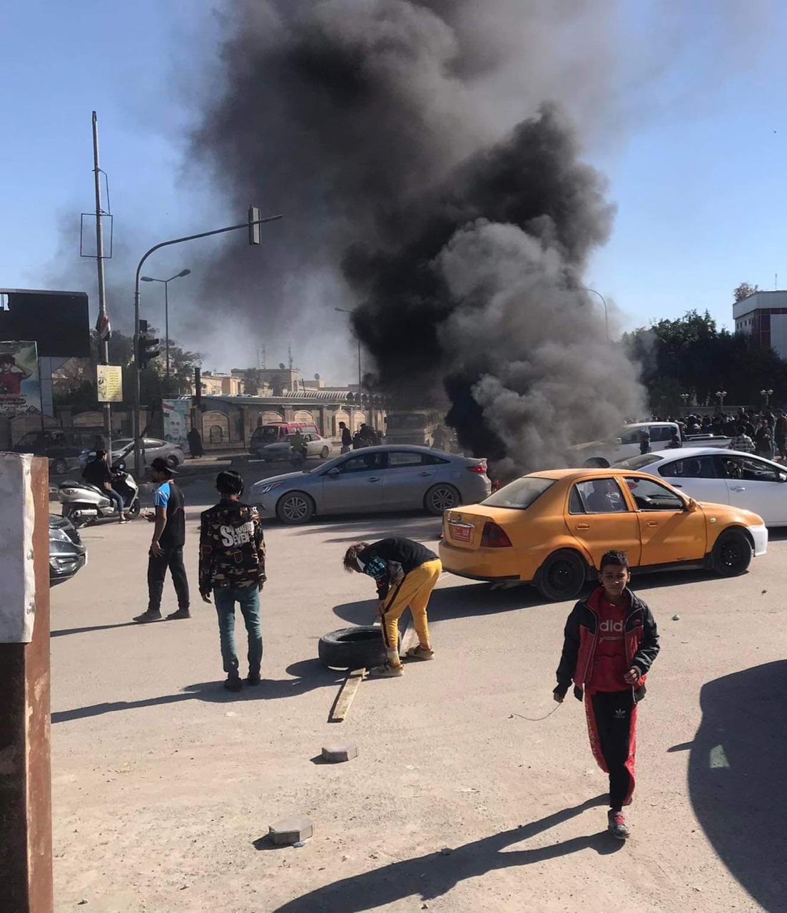 بالصور .. محتجون يغلقون تقاطع البهو بالاطارات المحترقة وسط الناصرية