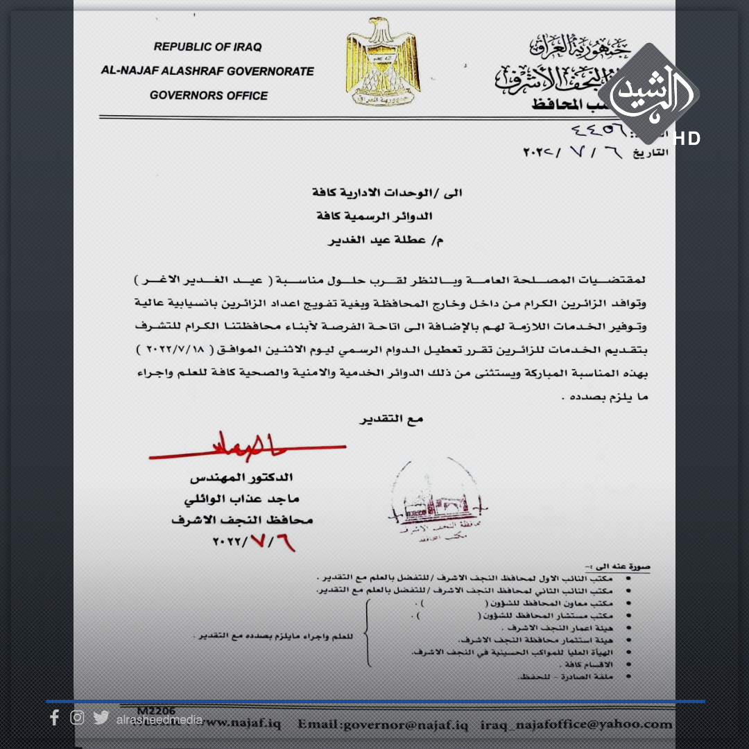 محافظة النجف تقرر تعطيل الدوام الرسمي يوم 18 من تموز الحالي