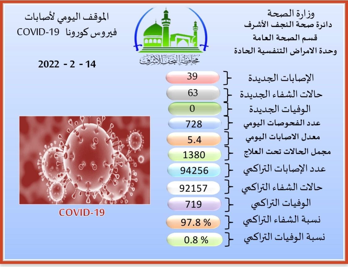 دون وفيات.. تسجيل 39 اصابة جديدة بفيروس كورونا في النجف