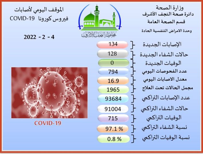 تسجيل 100 اصابة جديدة بفيروس كورونا في النجف