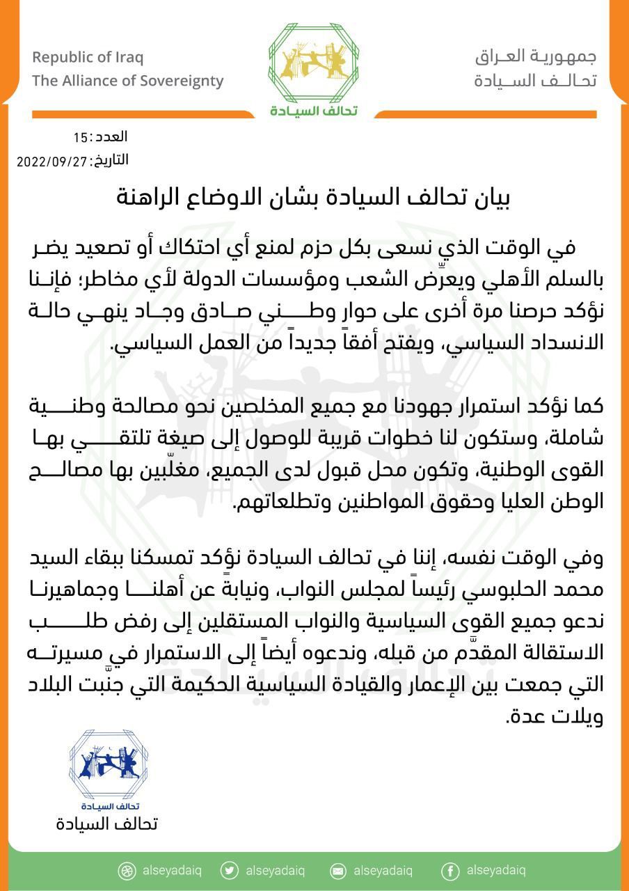تحالف السيادة يؤكد استعداده الدائم لدعم حوار حقيقي يؤسس لمرحلة جديدة تعيد للعراق مكانته