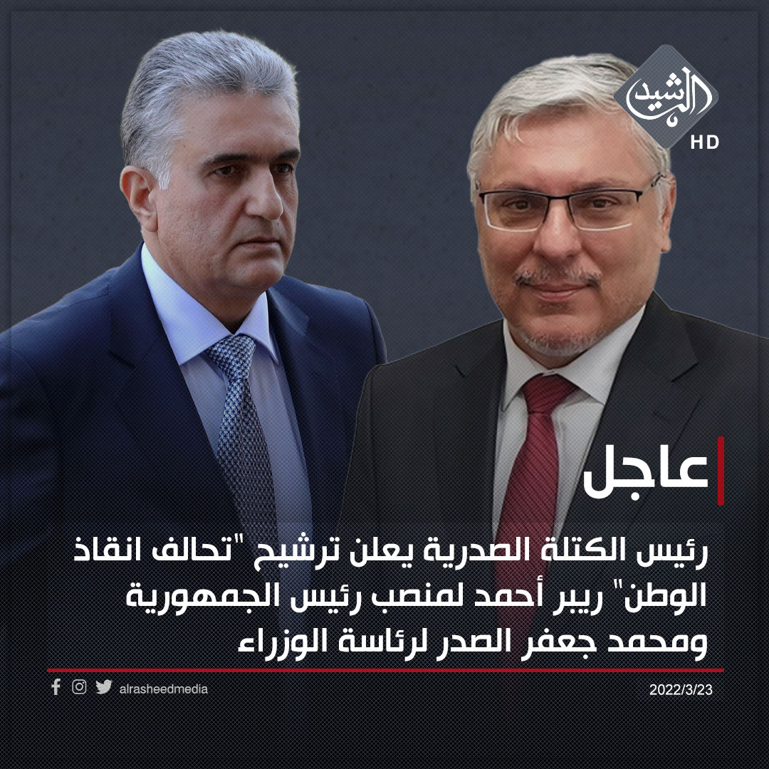 رئيس الكتلة الصدرية يعلن ترشيح "تحالف انقاذ الوطن" ريبر أحمد لمنصب رئيس الجمهورية ومحمد جعفر الصدر لرئاسة الوزراء