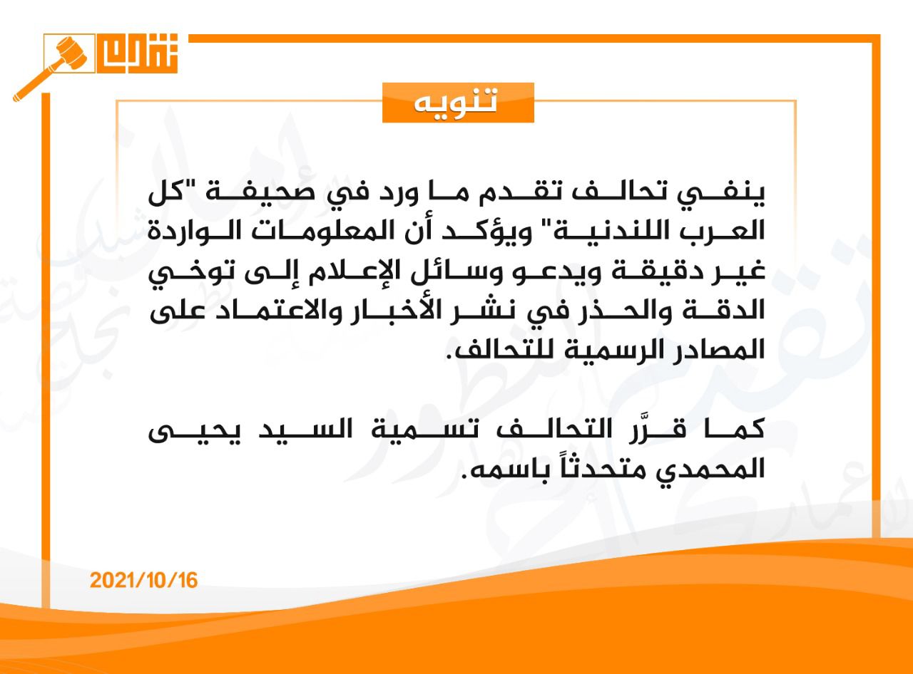 تحالف تقدم ينفي ما ورد في صحيفة كل العرب اللندنية ويدعو الى توخي الدقة والحذر في نشر الاخبار