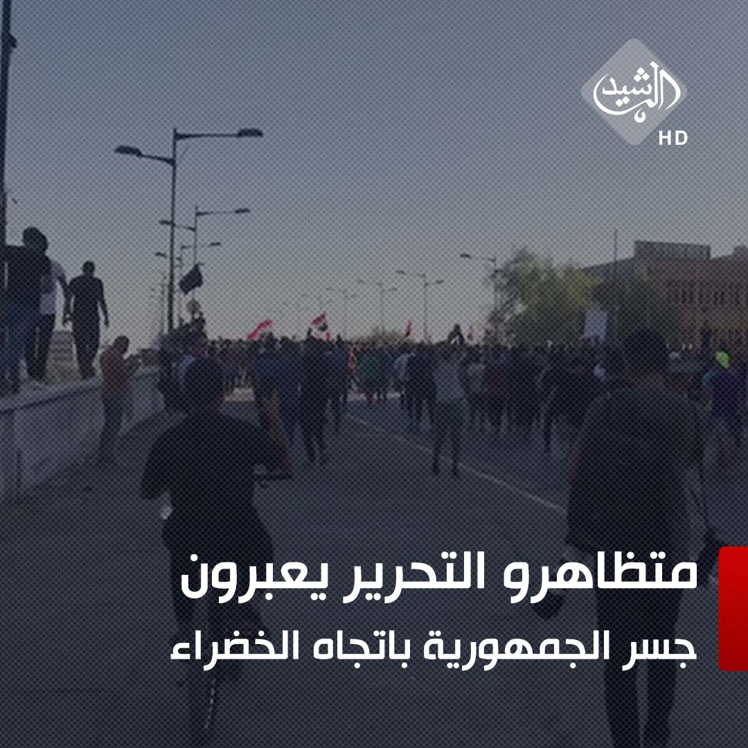 متظاهرو التحرير يعبرون جسر الجمهورية باتجاه المنطقة الخضراء وسط بغداد