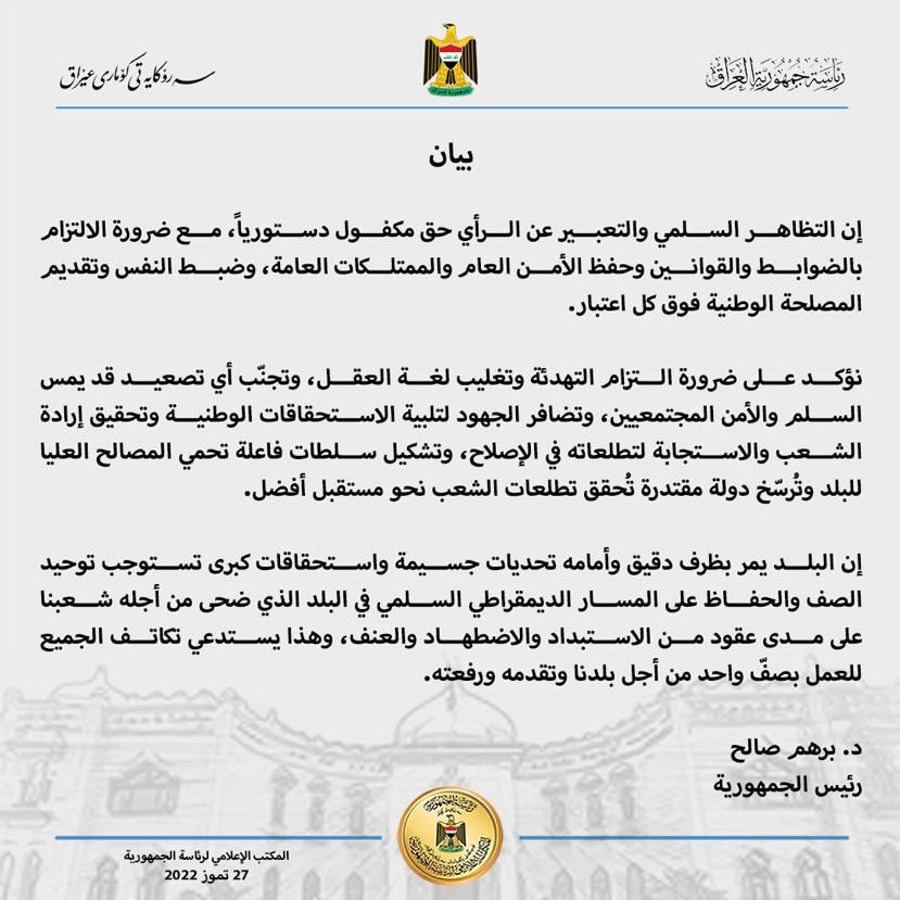 رئيس الجمهورية يطمئن على أوضاع الحجاج العراقيين