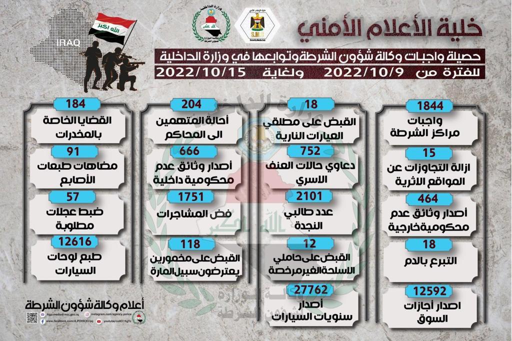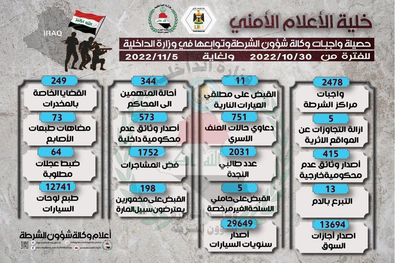 حصيلة واجبات وكالة شؤون الشرطة وتوابعها خلال الاسبوع الماضي