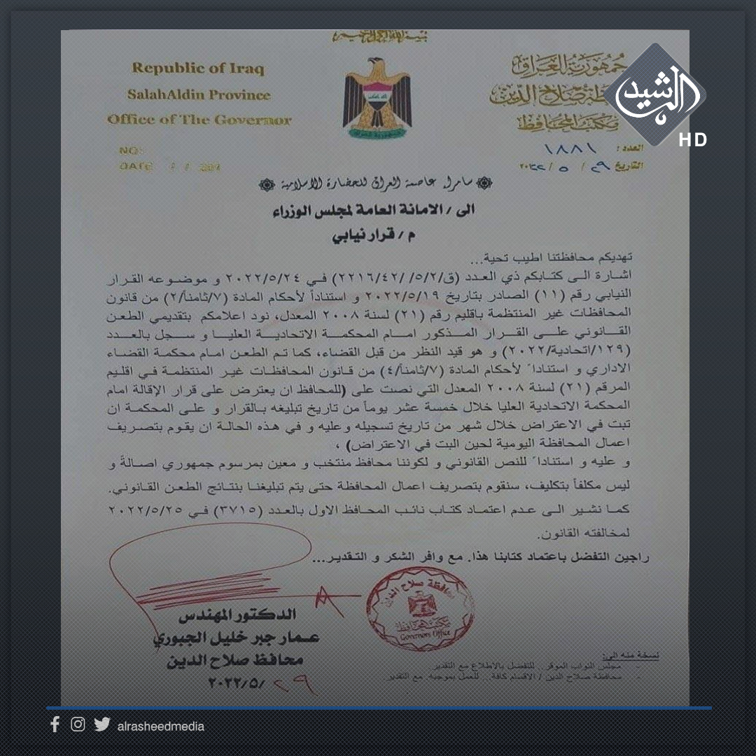 محافظة صلاح الدين تعطل الدوام الرسمي في دوائرها يوم غد السبت