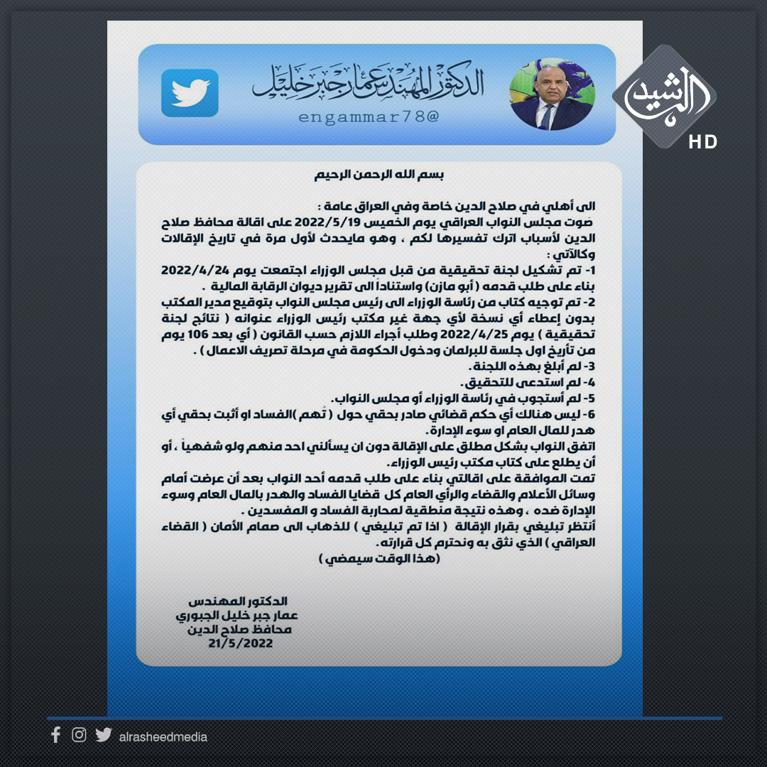 محافظ صلاح الدين يعلن تعطيل الدوام الرسمي يوم غد الثلاثاء