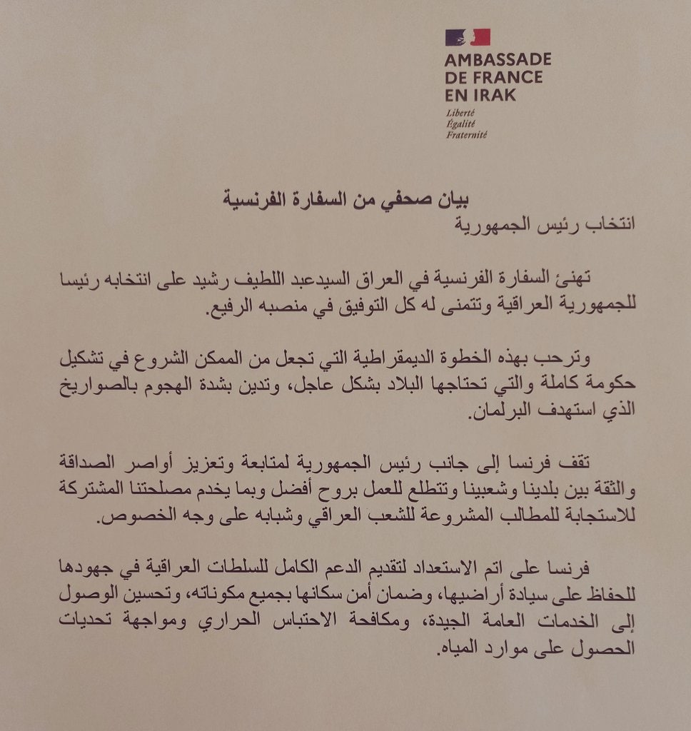 فرنسا تهنئ العراق بانتخاب رشيد رئيسا للجمهورية