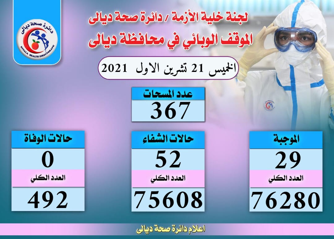 ديالى تسجل 29 اصابة جديدة بفيروس كورونا