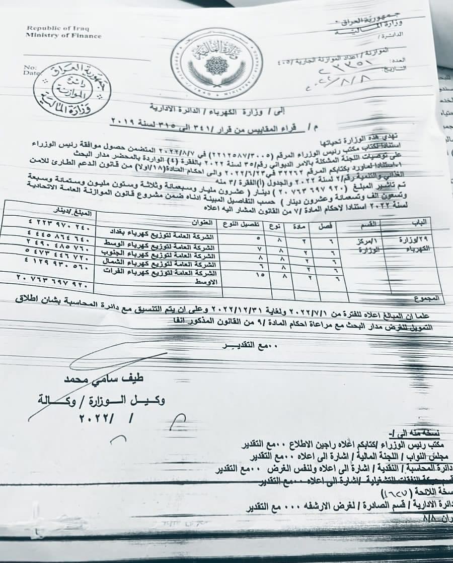 بالوثيقة.. المالية تطلق مبالغ قراء المقاييس بمديريات توزيع الكهرباء