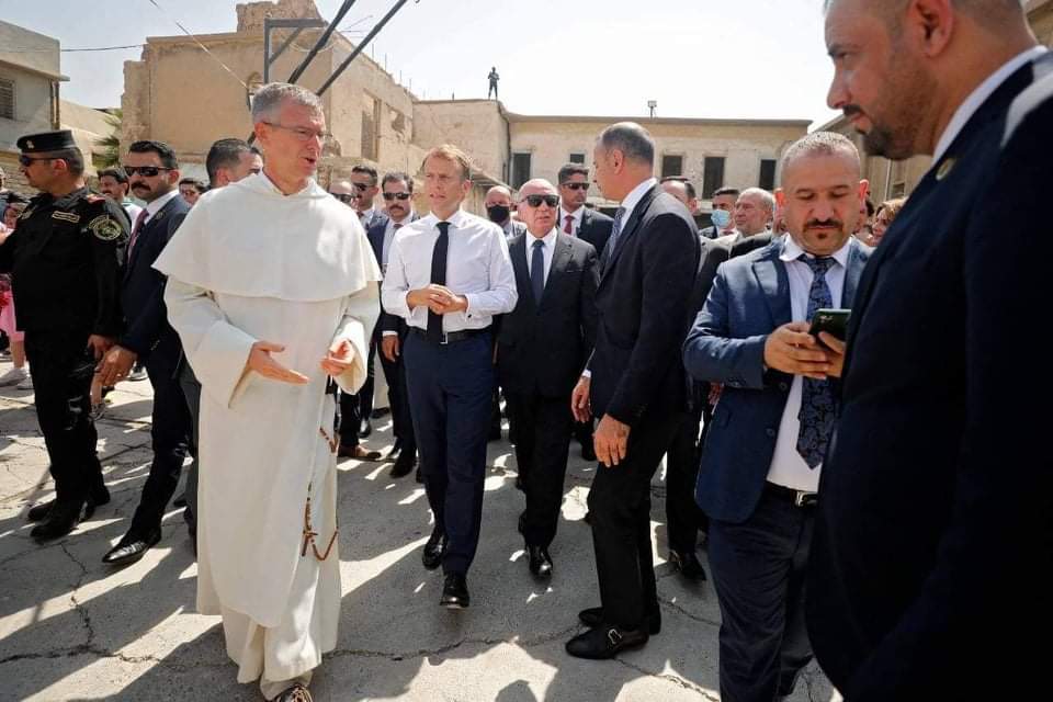 بالصور .. الرئيس الفرنسي ايمانويل ماكرون يزور كنيسة الساعة في مدينة الموصل