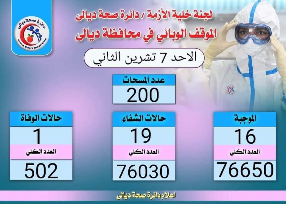 مؤشر كورونا في ديالى: 16 اصابة وحالة وفاة