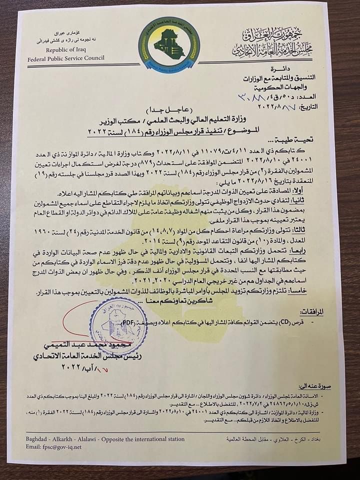 بالوثيقة.. مجلس الخدمة يصادق على تعيين الاوائل المشمولين بالقرار 184 لمجلس الوزراء