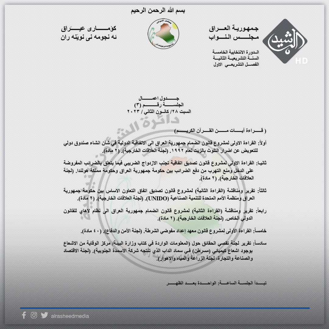 جدول اعمال مجلس النواب لجلسة السبت المقبل