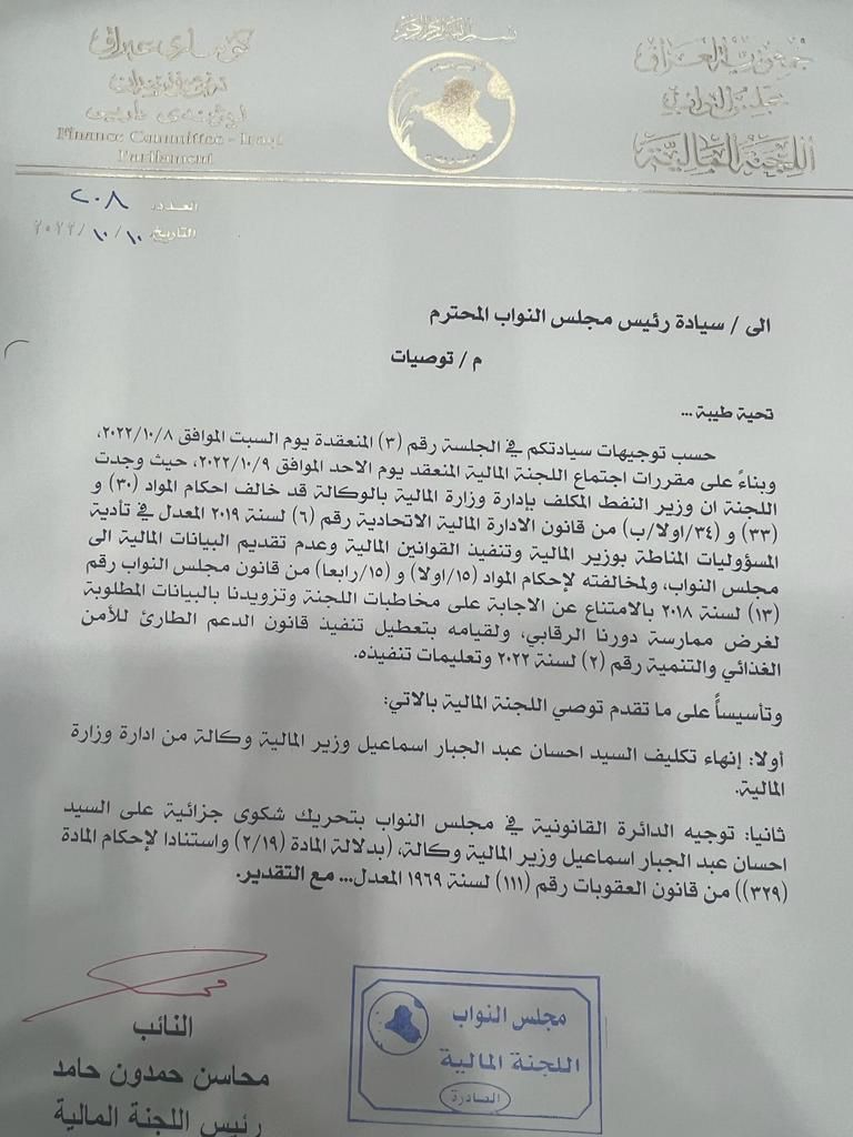بالوثيقة.. طلب نيابي لرئاسة مجلس النواب لإنهاء تكليف احسان عبدالجبار من ادارة وزارة المالية