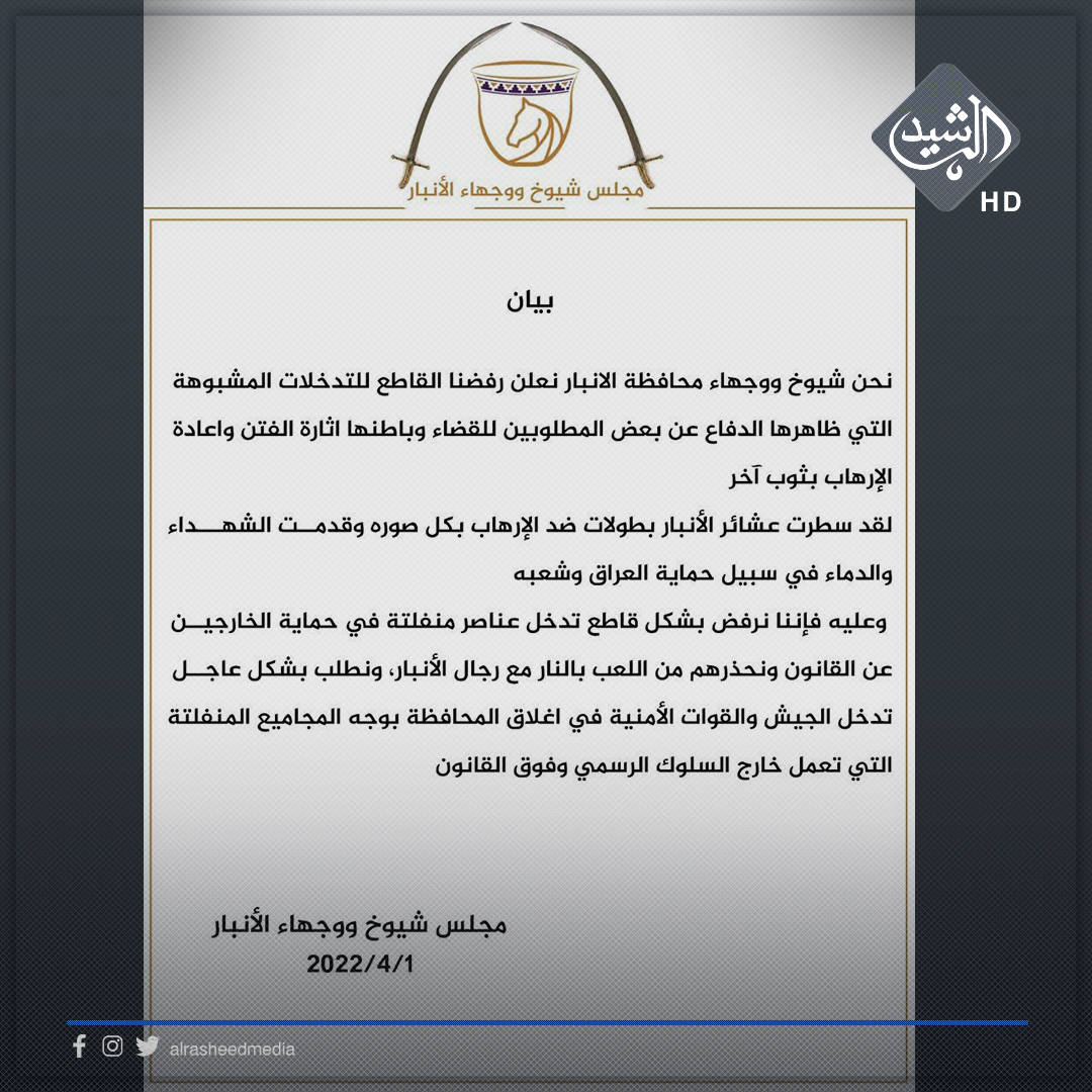 مجلس شيوخ ووجهاء الانبار: نعلن رفضنا القاطع للتدخلات المشبوهة التي ظاهرها الدفاع عن مطلوبين للقضاء وباطنها اثارة الفتن
