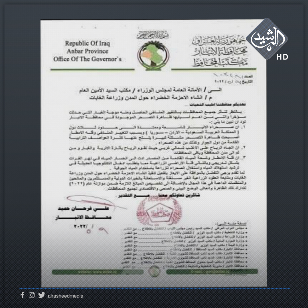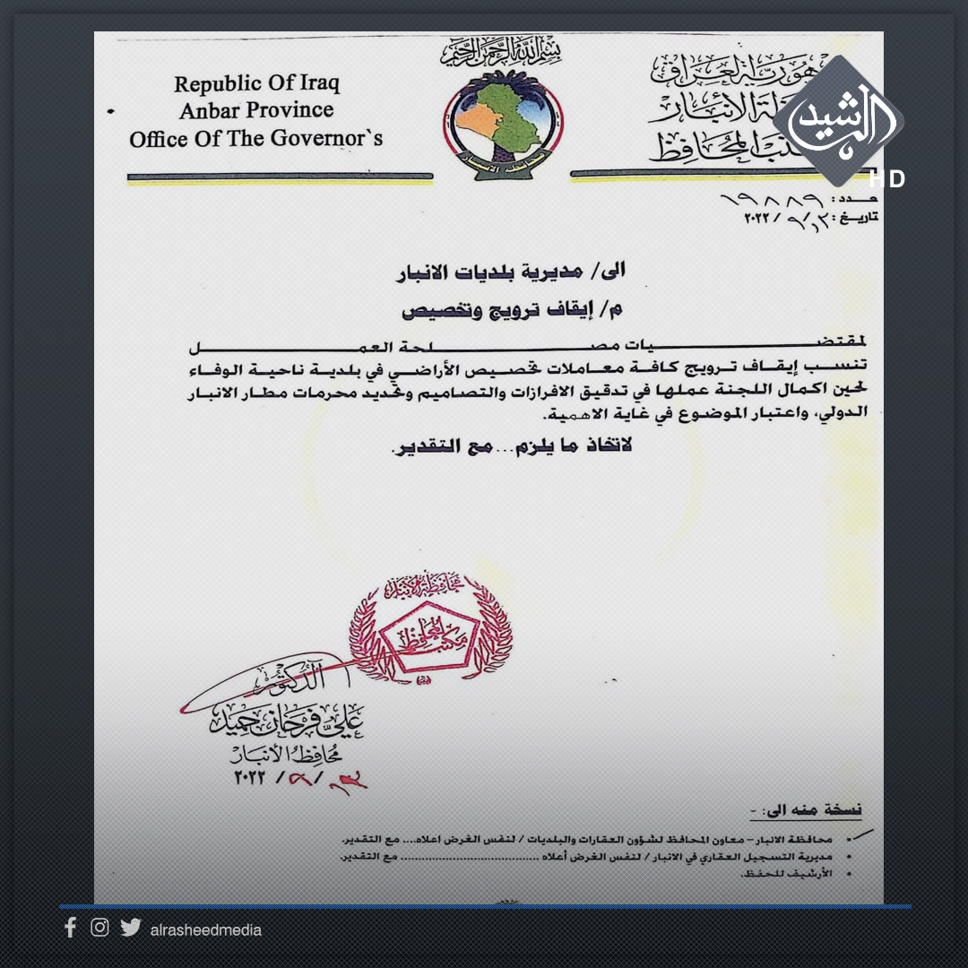 بالوثيقة.. محافظ الانبار يوجه بإيقاف ترويج معاملات تخصيص الاراضي بناحية الوفاء لحين تحديد محرمات المطار