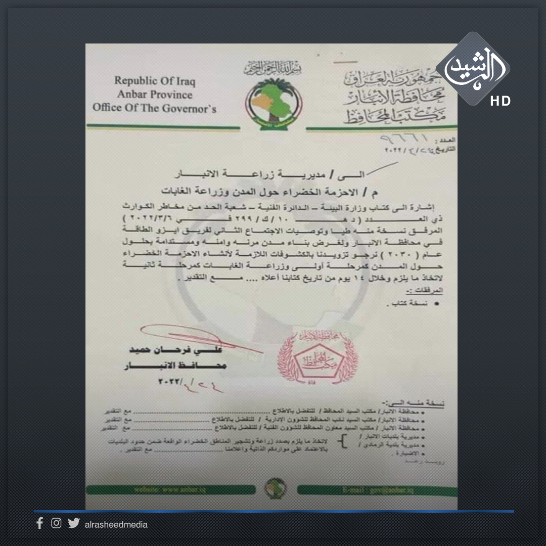 بالوثيقة.. محافظ الانبار يوجه مديرية الزراعة بالاسراع باستكمال اجراءات مشروع الاحزمة الخضراء