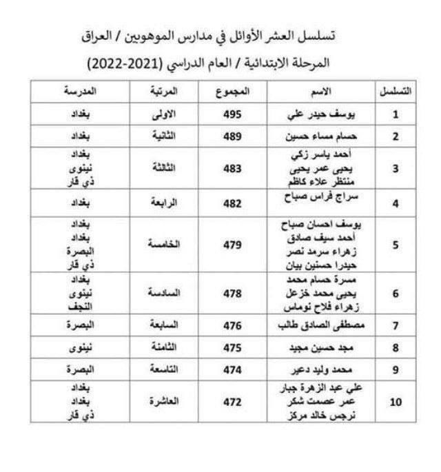 الرشيد تنشر تسلسل العشرة الأوائل بمدارس الموهوبين المرحلة الابتدائية 2022