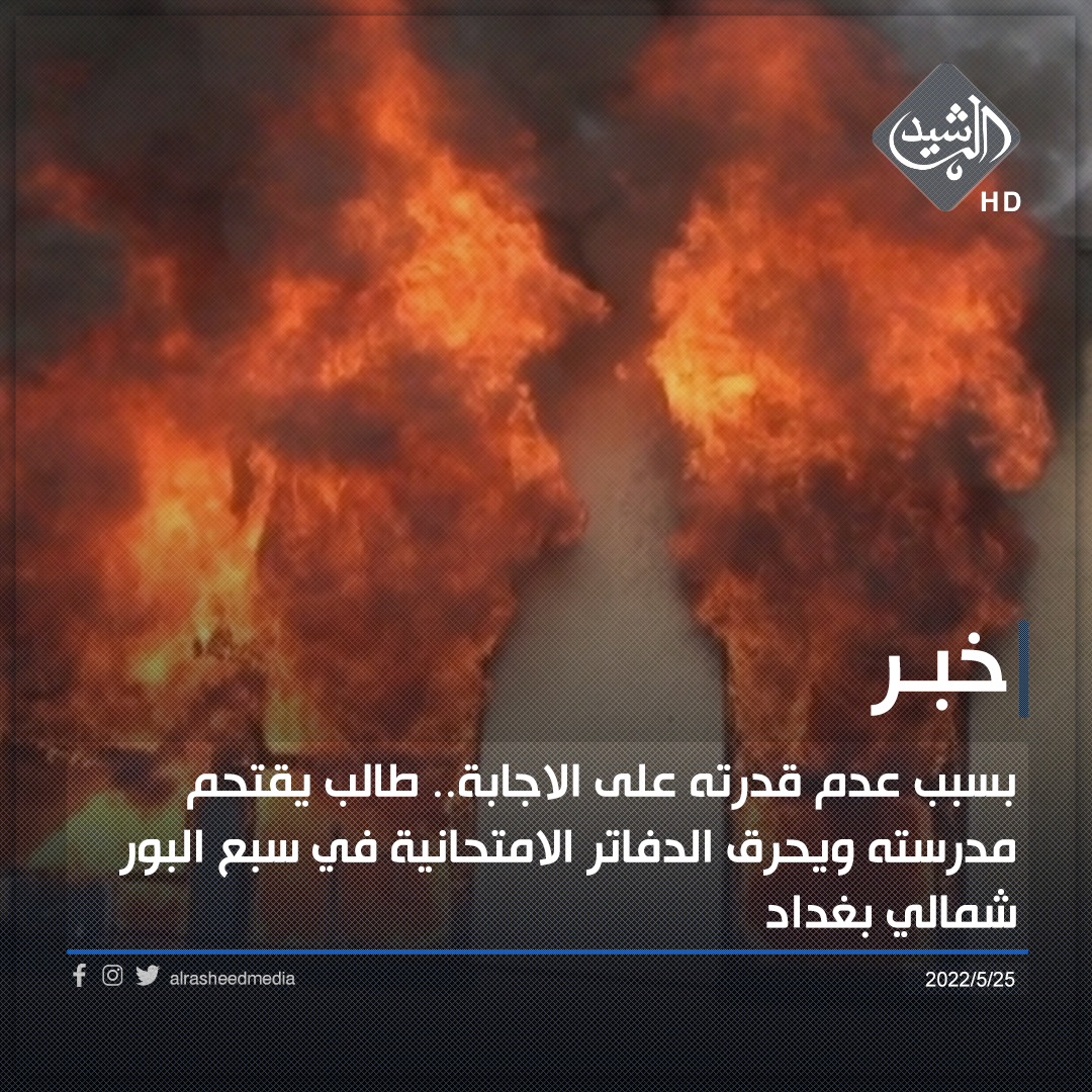 بسبب عدم قدرته على الاجابة.. طالب يقتحم مدرسته ويحرق الدفاتر الامتحانية في سبع البور شمالي بغداد