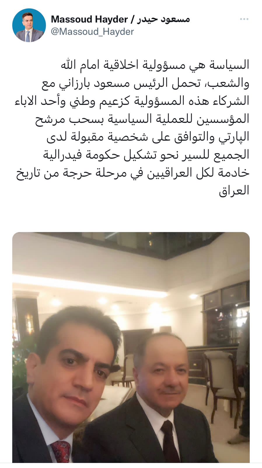 مسعود حيدر: بارزاني سحب مرشح الديمقراطي للسير نحو تشكيل حكومة خادمة لكل العراقيين