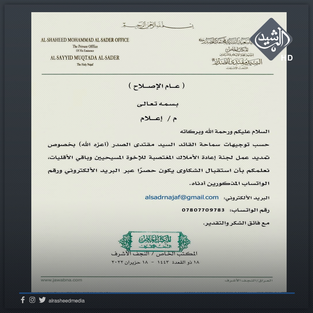 بالوثيقة.. توجيه جديد من مكتب السيد الصدر بشأن املاك المسيحيين وباقي الاقليات
