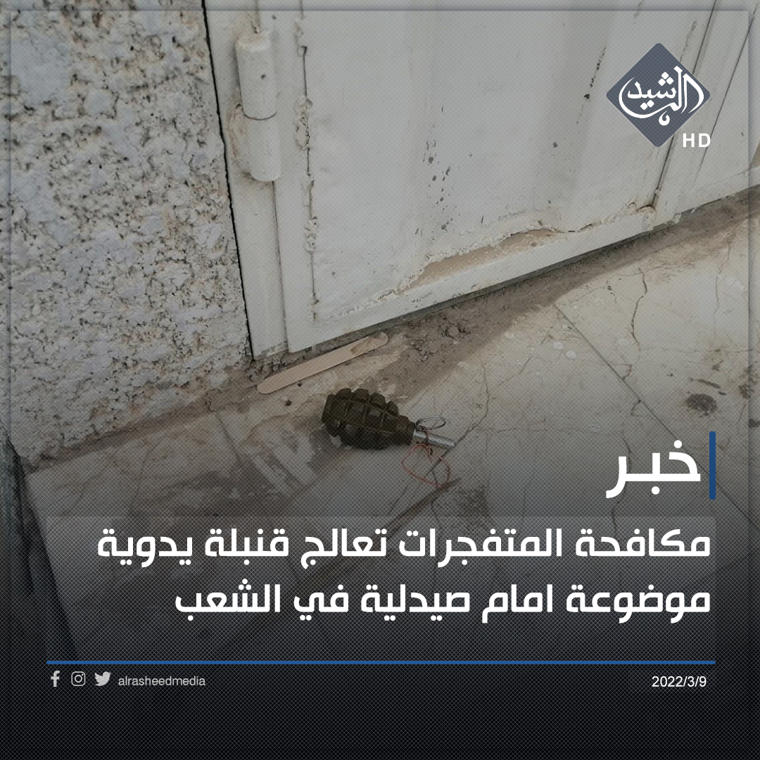 مكافحة المتفجرات تعالج قنبلة يدوية موضوعة امام صيدلية في الشعب