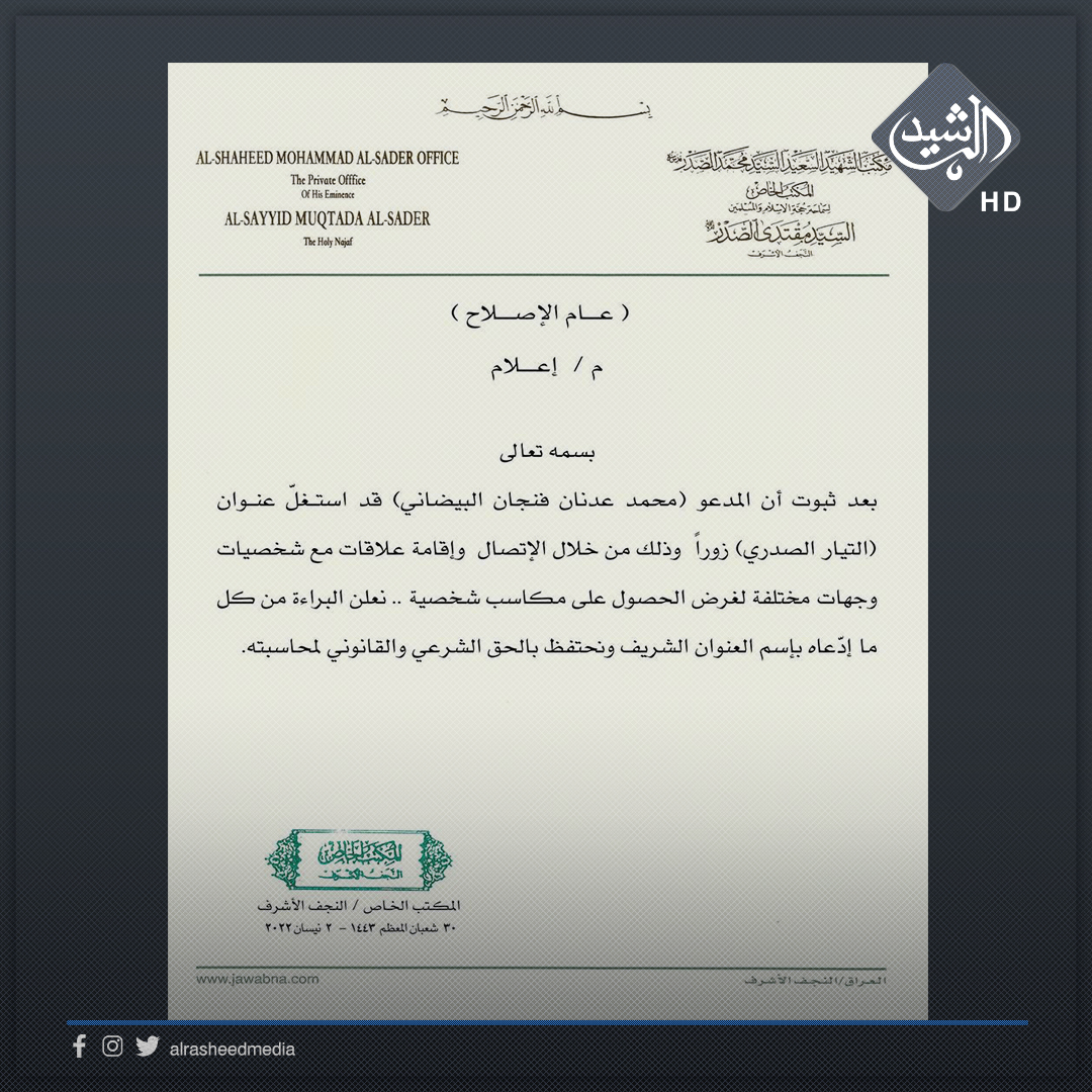 بالوثيقة .. مكتب الصدر يتبرأ من شخص استغل اسم التيار للحصول على مكاسب