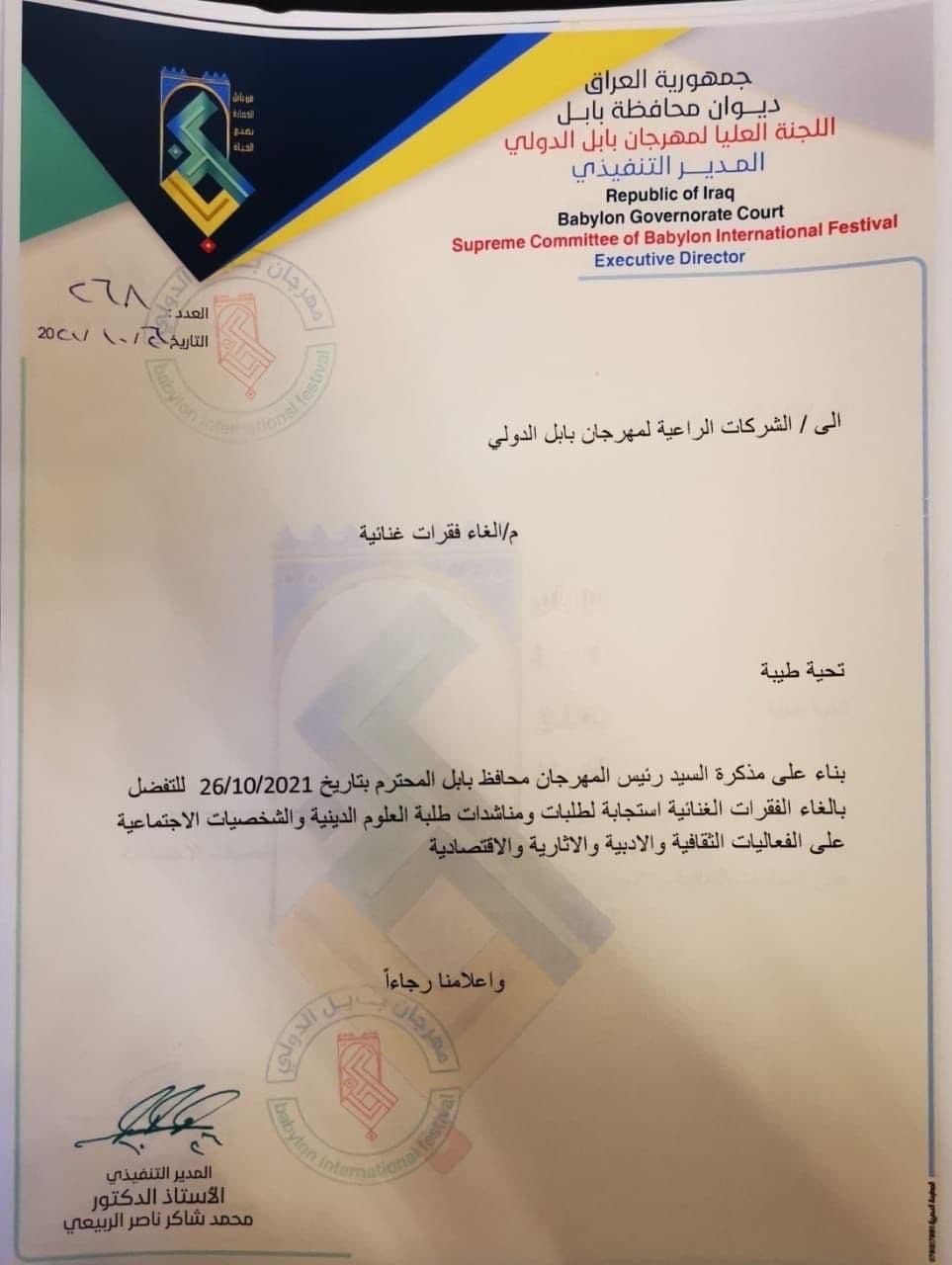 بالوثائق.. محافظ بابل يوافق على الغاء الفقرات الغنائية بمهرجان بابل