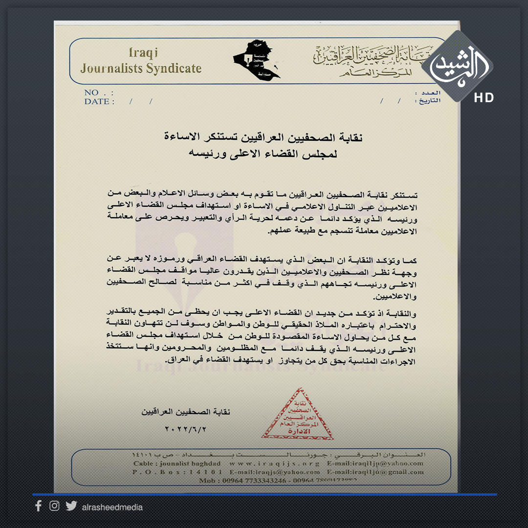 نقابة الصحفيين العراقيين تستنكر الاساءة لمجلس القضاء الاعلى ورئيسه