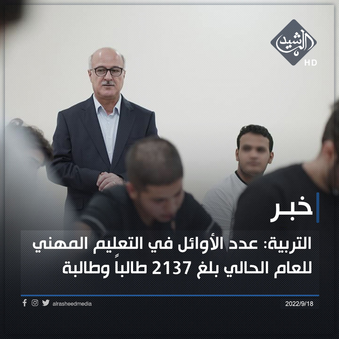 التربية: عدد الطلبة الأوائل في التعليم المهني للعام الحالي بلغ 2137 طالباً وطالبة