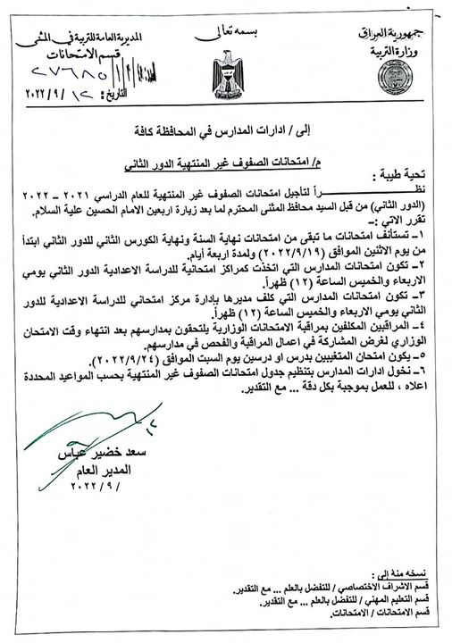 بالوثيقة.. تربية المثنى تحدد موعد استئناف امتحانات الدور الثاني للمراحل غير المنتهية