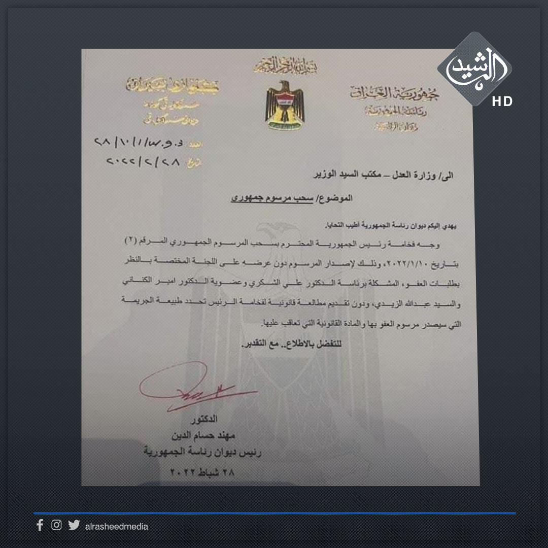 بالوثيقة.. قرار رئيس الجمهورية بشأن إلغاء العفو عن نجل محافظ النجف السابق