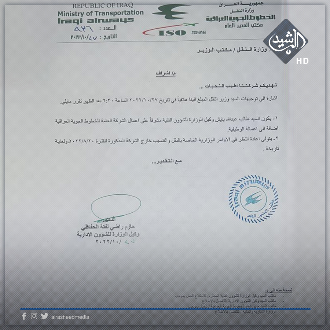 بالوثيقة .. تكليف الوكيل الفني لوزارة النقل بالاشراف على شركة الخطوط الجوية العراقية