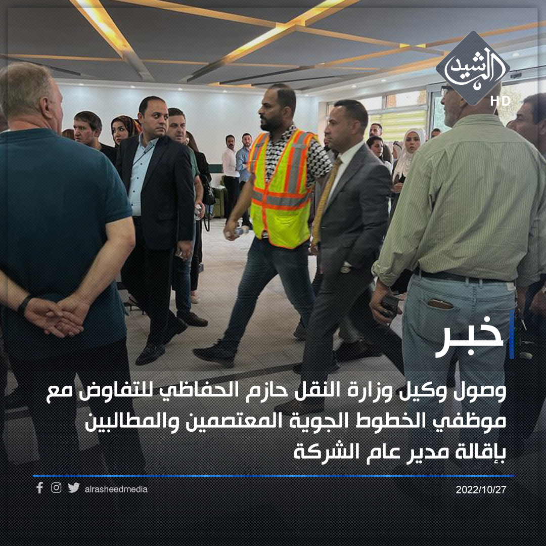 بالصورة.. وصول وكيل وزارة النقل حازم الحفاظي للتفاوض مع موظفي الخطوط الجوية المعتصمين والمطالبين بإقالة مدير عام الشركة