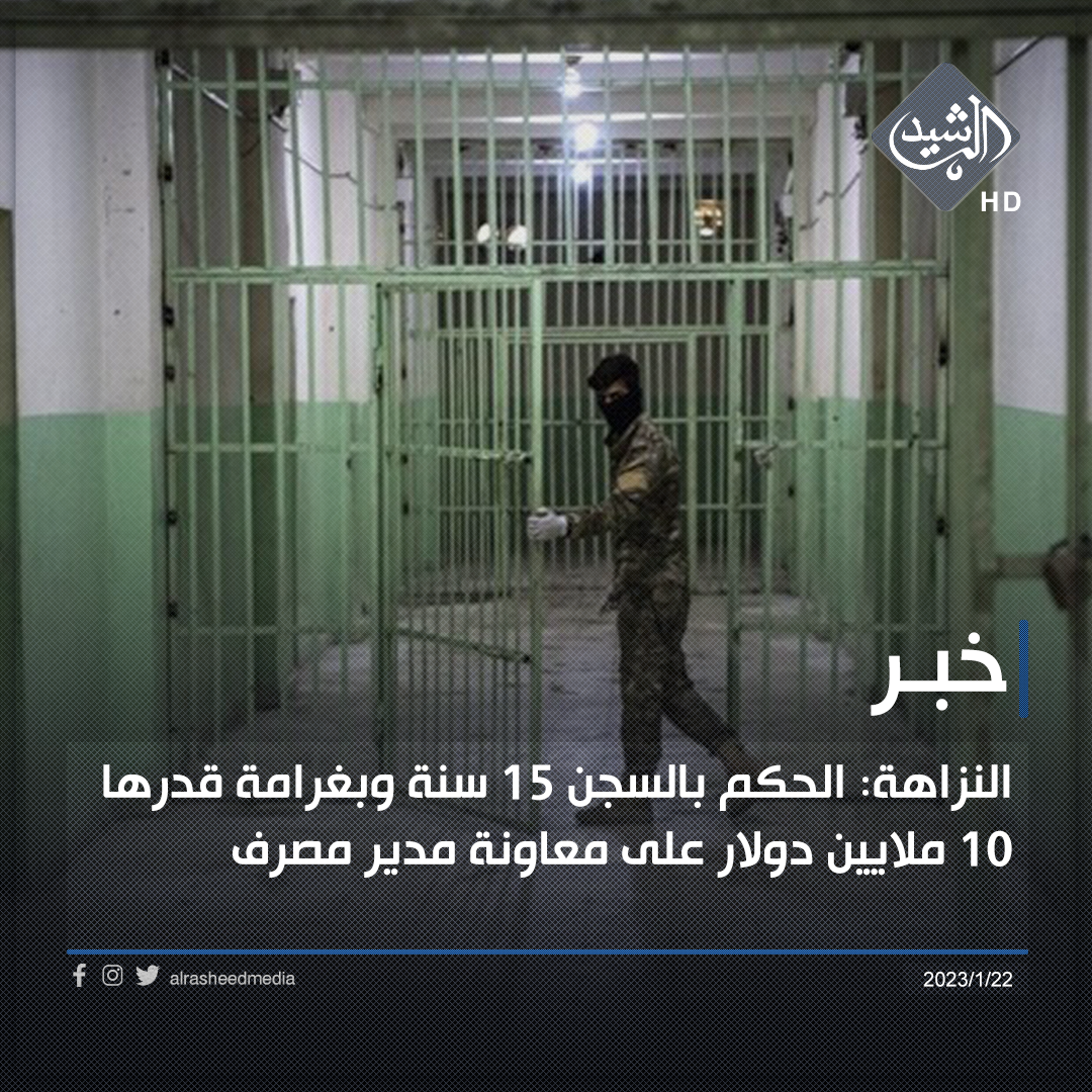 النزاهة: الحكم بالسجن 15 سنة وبغرامة قدرها 10 ملايين دولار على معاونة مدير مصرف