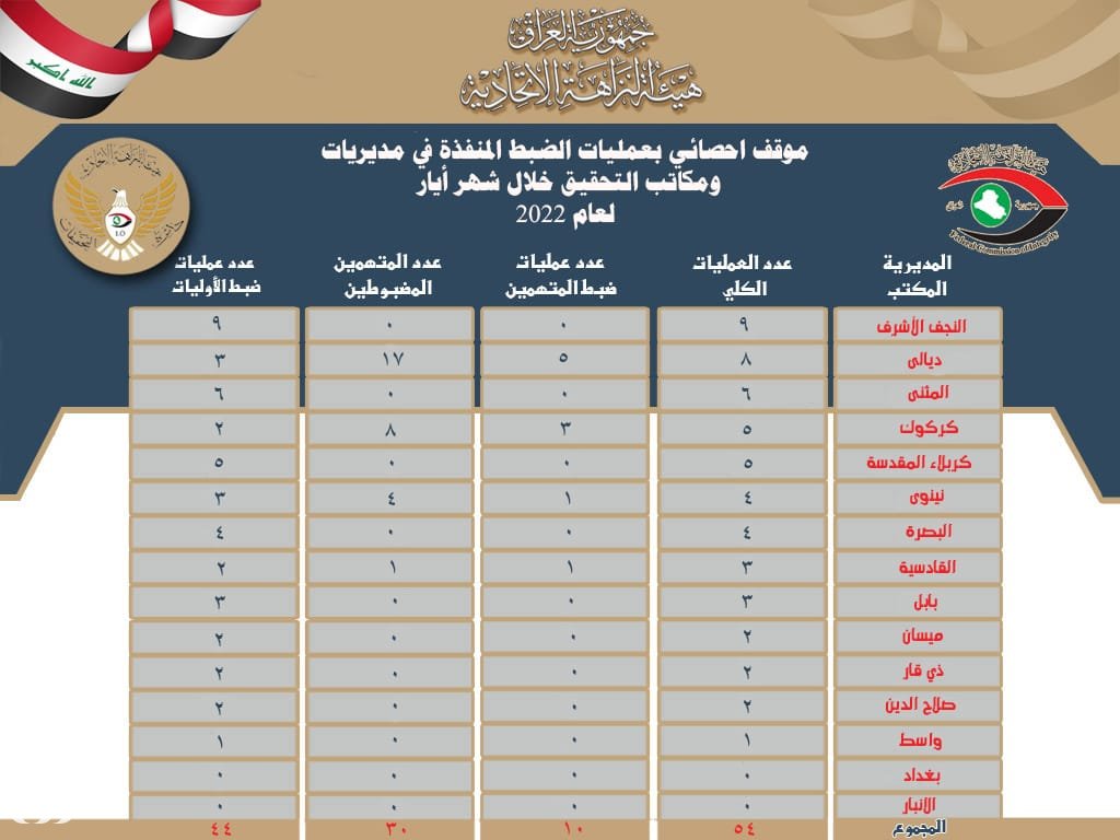 النزاهة: مديريات ومكاتب تحقيق الهيئة نفذت 54 عملية ضبط في أيار