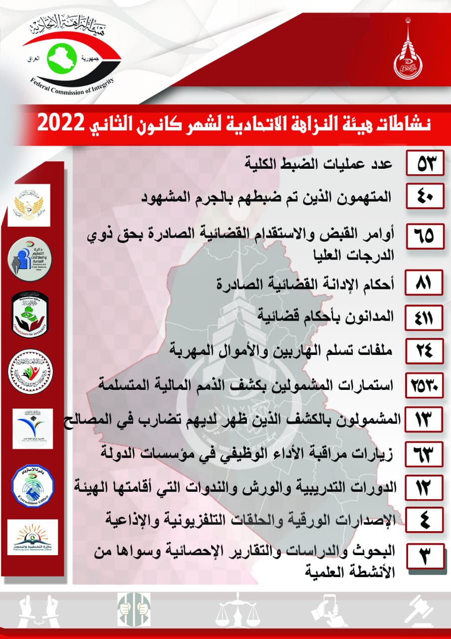 بالجدول.. هيئة النزاهة تعلن انجازاتها لشهر كانون الثاني الماضي