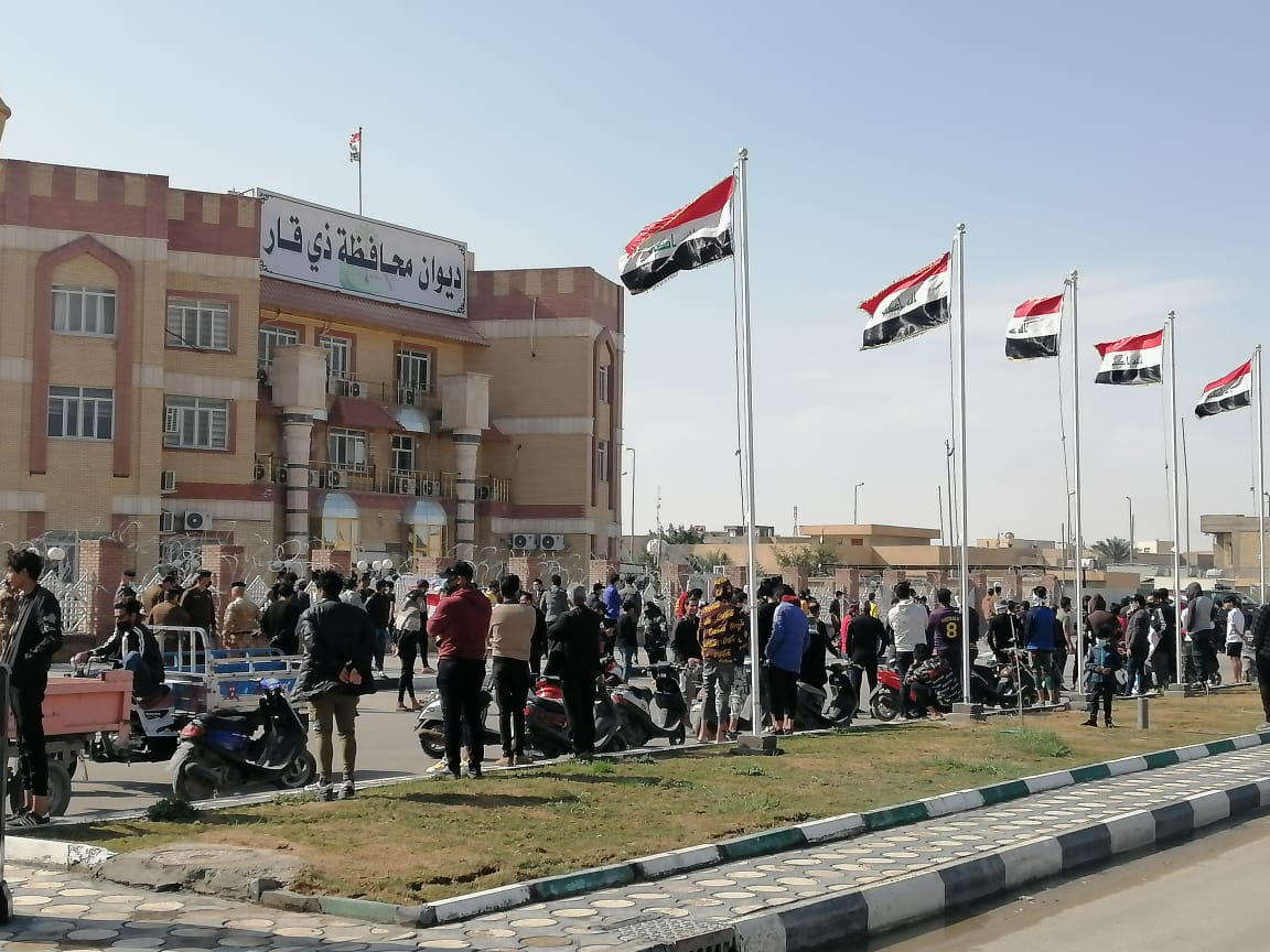 بالصور .. العشرات يتظاهرون أمام ديوان مبنى محافظة ذي قار مطالبين باقالة المحافظ