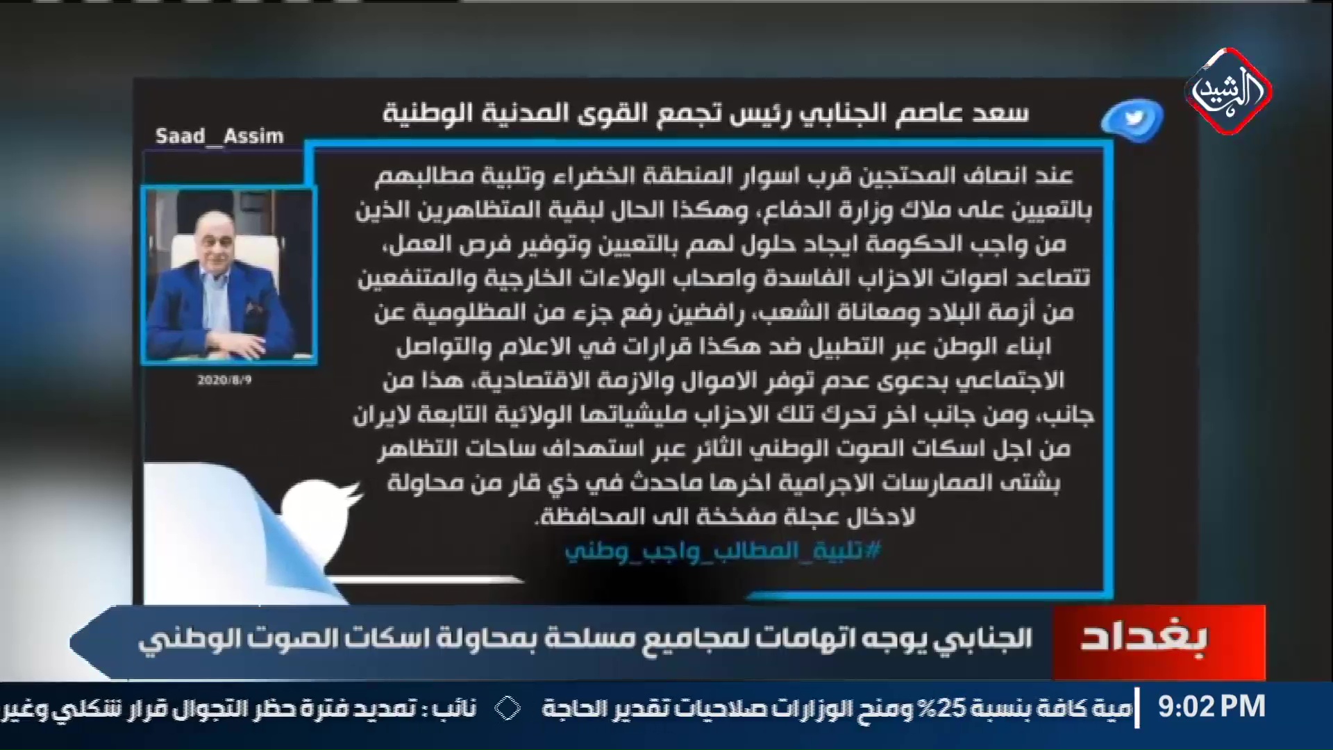 الجنابي يوجه اتهامات لمجاميع مسلحة بمحاولة اسكات الصوت الوطني