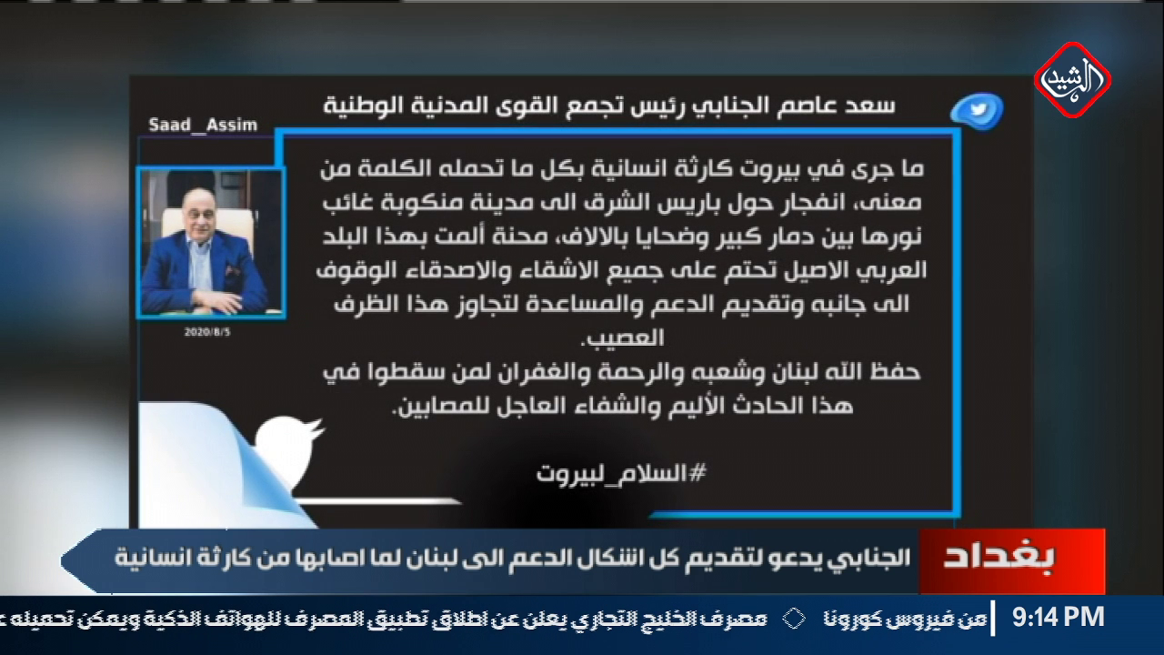 الجنابي يدعو لتقديم كل أشكال الدعم الى لبنان لما أصابها من كارثة إنسانية